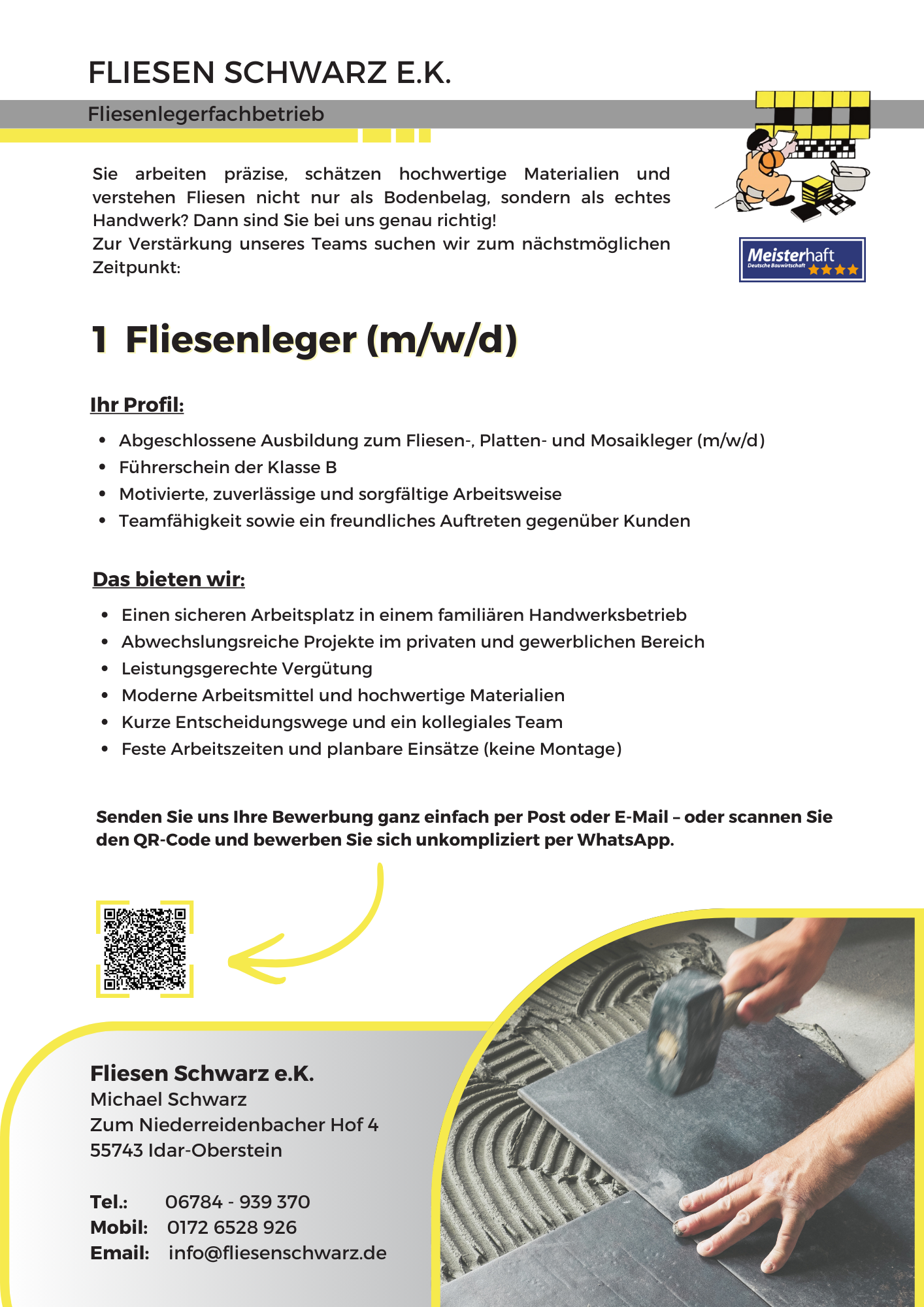 Mit über 40 Jahren Erfahrung stehen wir bei Fliesen Schwarz e.K. für hochwertige Fliesen- und Natursteinarbeiten im Innen- und Außenbereich. Unser Anspruch ist es, individuelle Wohnträume zu realisieren – von klassischen Bädern bis hin zu barrierefreien Komplettlösungen. Zur Verstärkung unseres Teams suchen wir engagierte Mitarbeiter, die unsere Leidenschaft für präzises Handwerk teilen.