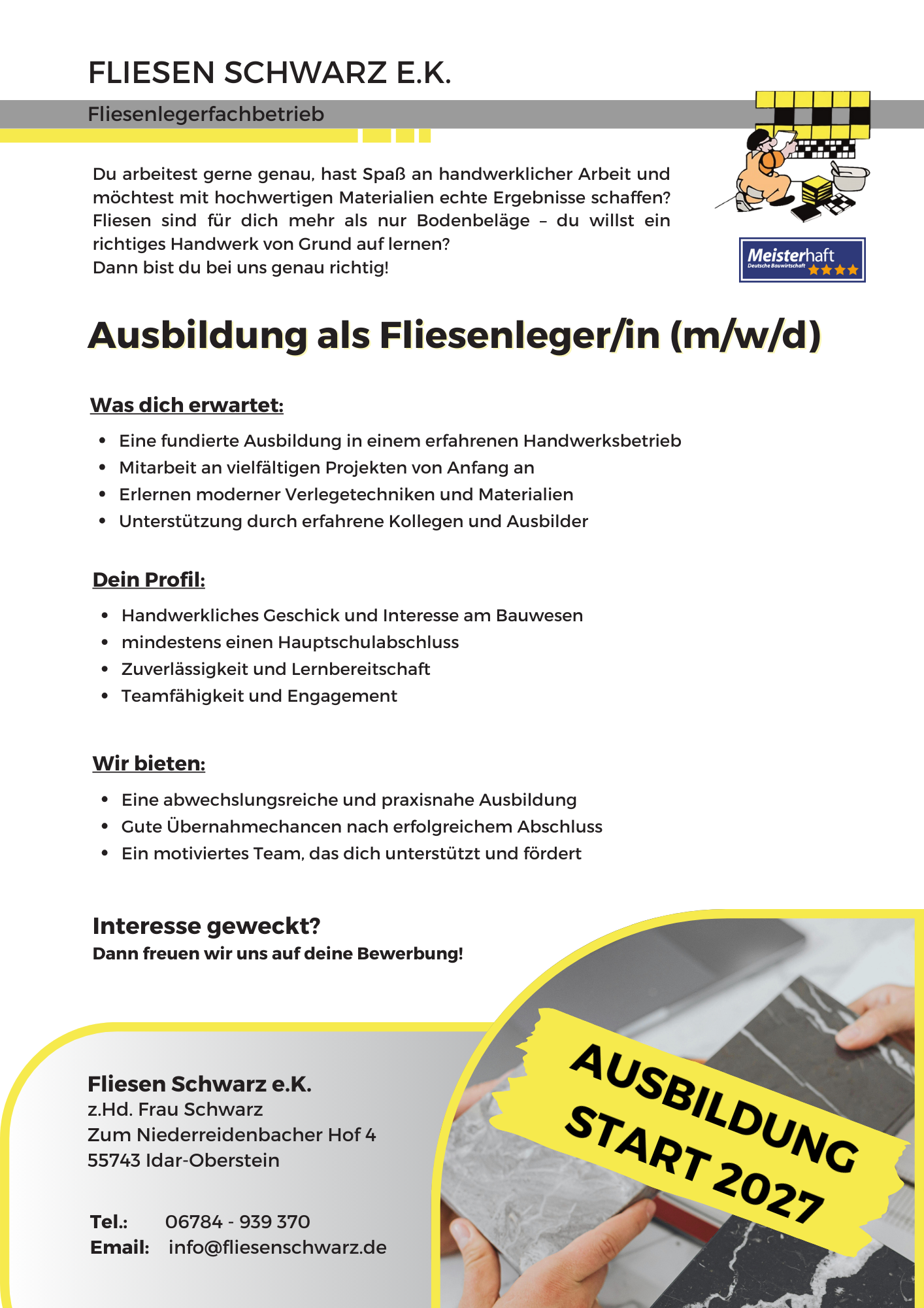 Mit über 40 Jahren Erfahrung stehen wir bei Fliesen Schwarz e.K. für hochwertige Fliesen- und Natursteinarbeiten im Innen- und Außenbereich. Unser Anspruch ist es, individuelle Wohnträume zu realisieren – von klassischen Bädern bis hin zu barrierefreien Komplettlösungen. Zur Verstärkung unseres Teams suchen wir engagierte Mitarbeiter, die unsere Leidenschaft für präzises Handwerk teilen.